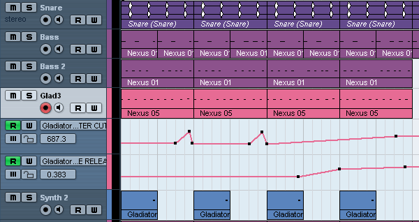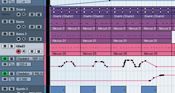 Это был простейший пример. Перейдем к автоматизации параметров инструментов. Откроем, скажем, последний, добавленный инструмент Gladiator, нажмем кнопочку «W», запустим воспроизведение, и в нужном месте покрутим какую-нибудь ручку, например Cutoff и Release. Остановим воспроизведение, нажмем на инструменте «R». Автоматизация записалась, но, скорее всего, не очень точно и гладко, и наша задача теперь ее поправить.