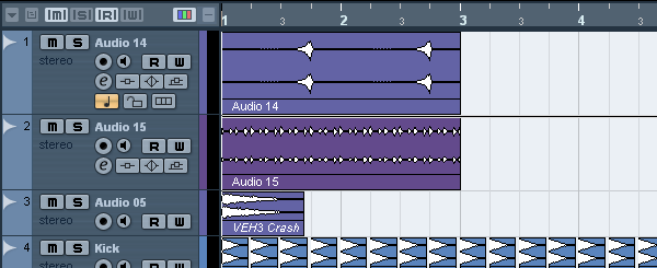 А теперь давайте выделим содержимое обеих этих дорожек и нажмем клавишу [В], назначенную нами на команду Bounce в начале этой статьи. Cubase выдаст диалоговое окно «Replace events?» - нажимаем Replace. Содержимое каждой из этих двух дорожек будет слито из нескольких регионов в один, новый аудио-регион.