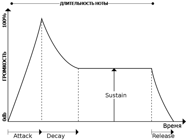 Взглянем на схему действия огибающей в процессе звучания ноты: