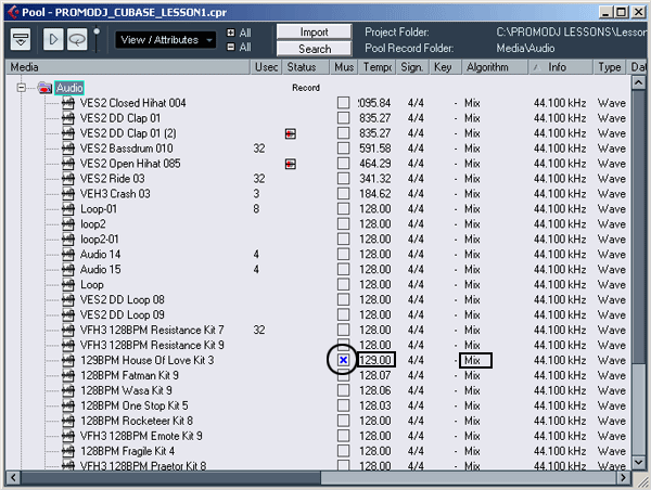 Здесь хранится информация обо всех аудиофайлах, добавленных в наш проект. Обратите внимание на обведенные элементы – галочка Music Mode включает изменение темпа аудиофайла под темп проекта, в поле Tempo мы задаем оригинальный BPM добавленного аудиофайла, а в поле Algorithm мы можем выбрать алгоритм изменения скорости, наиболее соответствующий нашей задаче (Mix, Vocals, Drums и.т.д.).