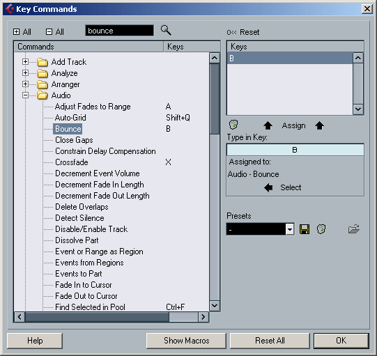 Если данная комбинация клавиш не была назначена ранее, она просто появится в поле Type in Key. Теперь остается только нажать кнопку Assign, и комбинация клавиш будет привязана к выбранной команде. Но в нашем случае, Cubase, скорее всего, скажет, что клавиша [В] уже была назначена на другое действие, и спросит, хотим ли мы отменить предыдущее действие комбинации. Нажмем "Assign" и команда назначена. Таким же образом вы можете найти любое действие и назначить ему свою горячую клавишу!