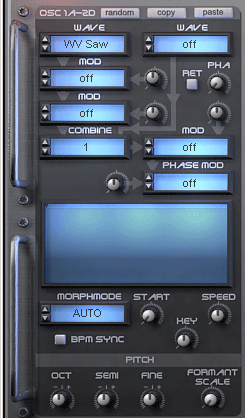 Перед нами предстанет пустой пресет с одним активным осциллятором. Выглядит угрожающе, но на практике все не так страшно. Интерфейс плагина побит на вполне определенные логические блоки – слева два блока осцилляторов, сейчас включен только один из них и в нем выбрана пилообразная форма волны – WV Saw: