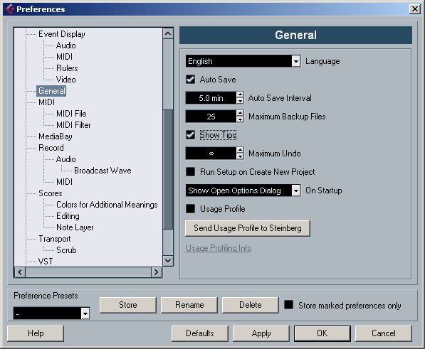 В Cubase существует возможность автосохранения проекта через заданный временной промежуток, но по умолчанию она отключена. Активация функции автосохранения через каждые, скажем, 2 минуты, избавит вас от постоянной необходимости нажимать [Ctrl+S], а для владельцев не очень стабильных компьютеров – вообще может стать настоящим спасением.