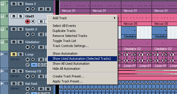 Для этого нажмем правой кнопкой на корешке дорожки Gladiator и выбираем пункт Show Used Automation (Selected Tracks):