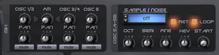 Также вы можете активировать другой осциллятор и попробовать смешать разные типы волн. Помимо двух основных осцилляторов в Gladiator имеется также шумовой осциллятор, в котором мы можем выбрать шум определенного типа и микшер, в котором мы можем определить баланс между разными осцилляторами, громкость каждого из них и положение в стереопанораме:
