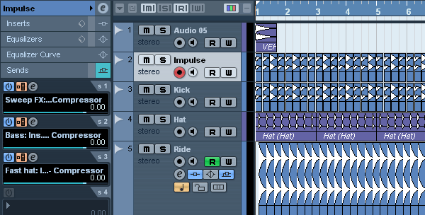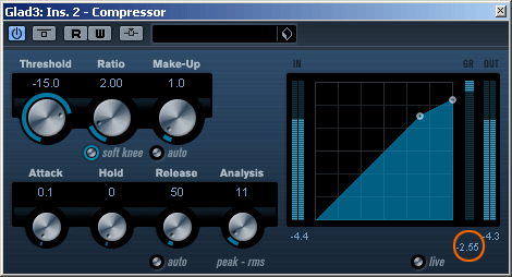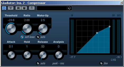 Теперь от теории перейдем к практике. Мы будем использовать стандартный встроенный компрессор Cubase 5: