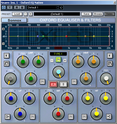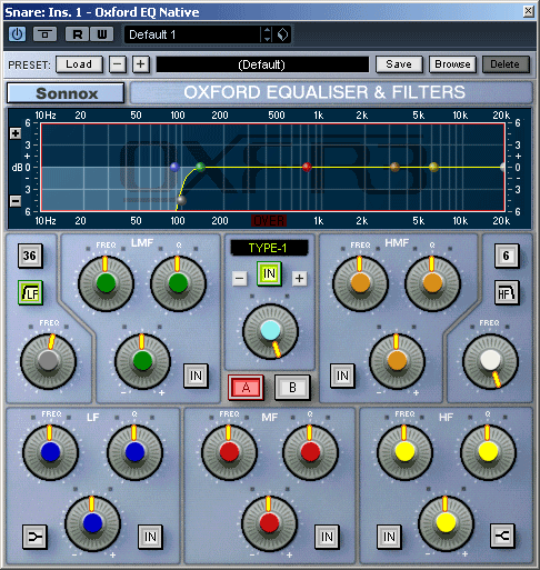 Откроем секцию Inserts дорожки снейра и добавим в первый слот эффектов эквалайзер Oxford EQ Native. Взглянем на интерфейс плагина: