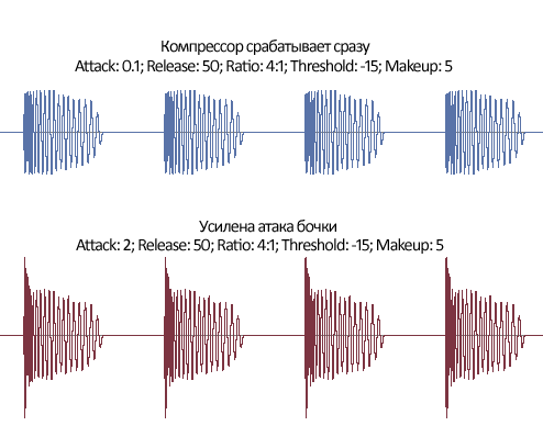 В качестве примера давайте посмотрим на вейвформ бочки, компрессированной с одними и теми же параметрами компрессии, с той лишь разницей, что в первом случае установлена минимальная атака и компрессор начинает срабатывать сразу, а во втором две миллисекунды атаки бочки пропускаются компрессором: