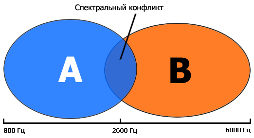 Возьмем любую композицию. Каждый инструмент имеет свой частотный диапазон (спектр), который может быть достаточно широк. Два разных инструмента могут звучать в разных, в целом, частотных диапазонах, однако частично они будут пересекать на определенных частотах.
