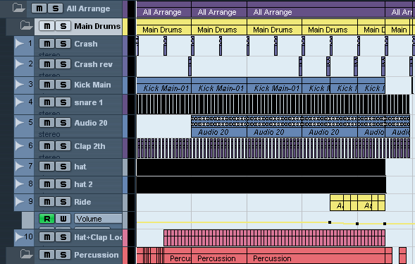 3) - Цветовая схема. Расписной радужный проект это прикольно, но лично у меня всегда все ударные - красного цвета, басы - желтого, солирующие инструменты - зеленого, падушки и струнные - синего, эффекты - фиолетовые а вокал - розовый. Зачем? Иной раз даже в названия дорожек вчитываться не приходится. Достаточно посмотреть на цвет дорожки и форму волны, чтобы понять что это то, что ты ищешь. Полезно, если у тебя в проекте 40-50 дорожек.