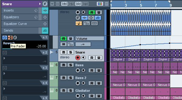 Оставим пока созданный канал в покое, и перейдем к каналам тех инструментов, которые мы будем посылать на обработку. Нажмем на любую дорожку, скажем Snare и в левой панели выберем секцию Sends, где мы можем послать звук с канала снейра на наш FX-канал, где он будет обработан ревербератором, с которого на мастер будет возвращен хвост от нашего звука: