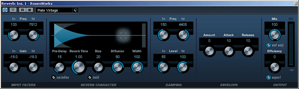 Выберем Reverb -> RoomWorks. в открывшемся окне RoomWorks выберите пресет Plate Vintage и выставим следующие настройки: