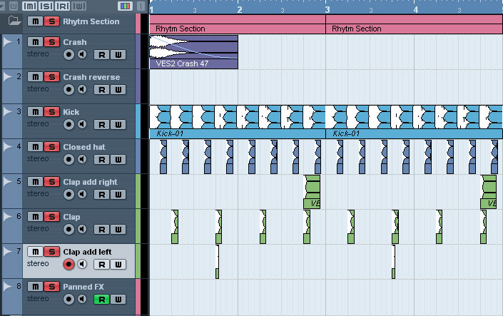 Возьмем самую простую ритм-секцию из самых простых тривиальных семплов, туда же добавлены закрытый хэт и крэш со стереодилеями, те самые о которых мы говорили при рассмотрении работы со стереодилеем. Звучит печально: