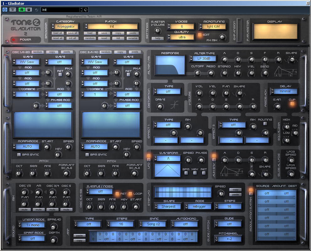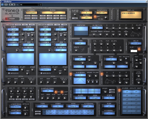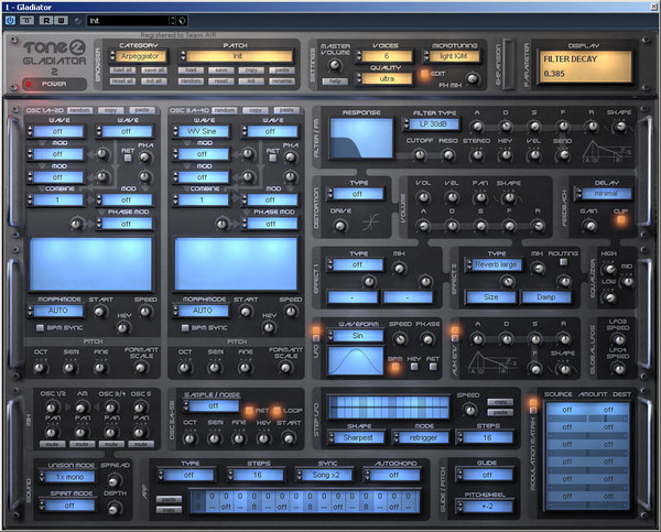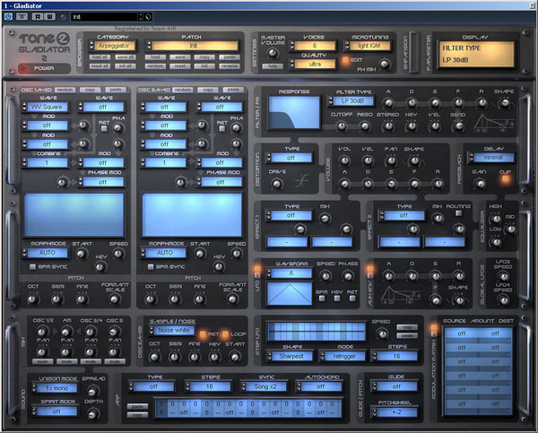 Итак, синтезируем простейший бас в Gladiator – он будет состоять из двух пилообразных осцилляторов с разницей в октаву, одного шумового генератора и одного LP-фильтра: