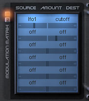Теперь когда генератор создает и создает нужную волну нужной частоты, нам необходимо назначить модуляцию какого-нибудь параметра, скажем Cutoff фильтра этим генератором и установить глубину действия LFO. Для этого создадим соответствующую привязку в секции Modulation Matrix синтезатора: