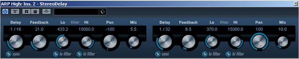 Далее обрабатываем дорожку арпеджио эквалайзером, стерео-дилэем и ревербератором, как это было описано выше, получаем следующее: