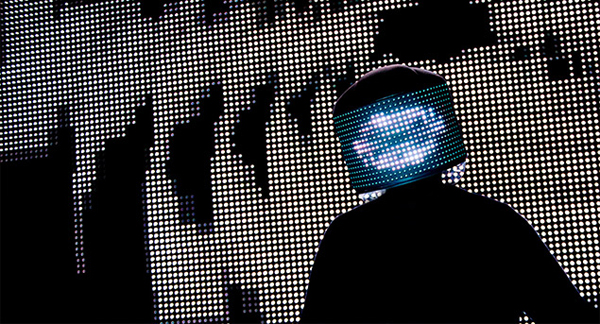 Ветеран IDM-сцены Squarepusher пошел дальше других. Led-экран, размещенный на его лице, проецирует изображения, синхронизирующиеся с его музыкой. Это надо видеть!