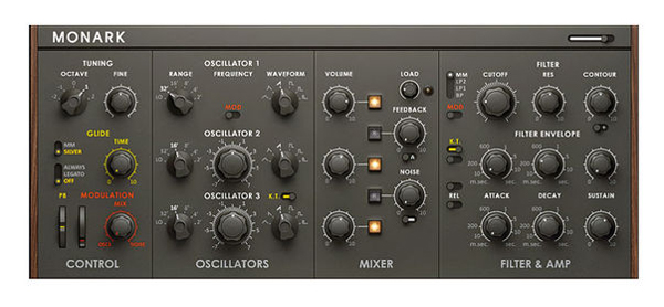Monark работает на базе NI’s Reaktor и Reaktor Player. Один из самых коммерчески успешных продуктов от компании NI создан как цифровой прототип легендарного синтезатора Minimoog. Среди всех современных VST-клонов классических винтажных моделей, Monark объективно входит в число лучших и наиболее близких к оригинальному звучанию.