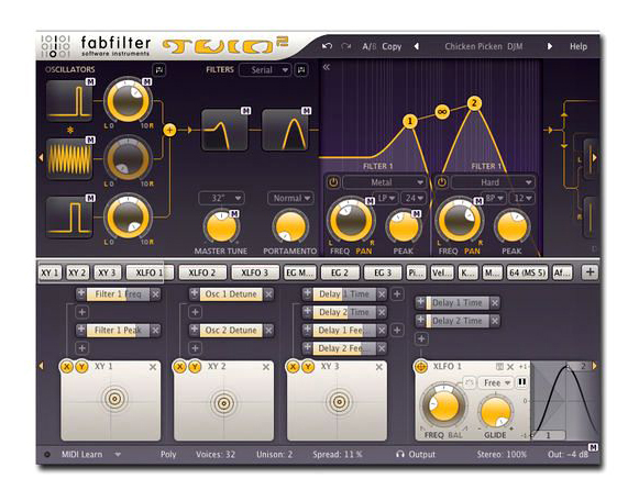 Внутри этого плагина три осциллятора, четыре фильтра с широким спектром настроек и умная система автоматической модуляции, которая открывает перед вами множество новых творческих возможностей. Все это упаковано в симпатичный, обтекаемый интерфейс, который делает синтезатор простым в использовании. Twin 2 не так массивен и богат, как многие его ровесники, но по части, собственно, звучания он может соперничать с такими моделями, как, например, Sylenth 1, находящийся в той же ценовой категории.