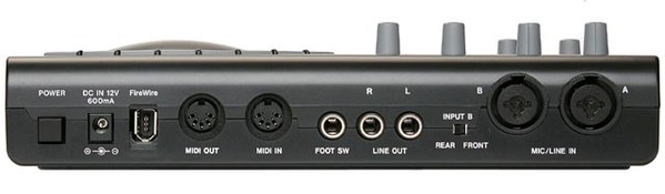 Из разъёмов на устройстве представлены: два микрофонных входа с поддержкой записи в формате 24 бит/96 кГц, два выхода на мониторы, MIDI-вход и выход, два выхода на наушники с индивидуальными регуляторами уровня громкости, разъём под педаль и гитарный вход.