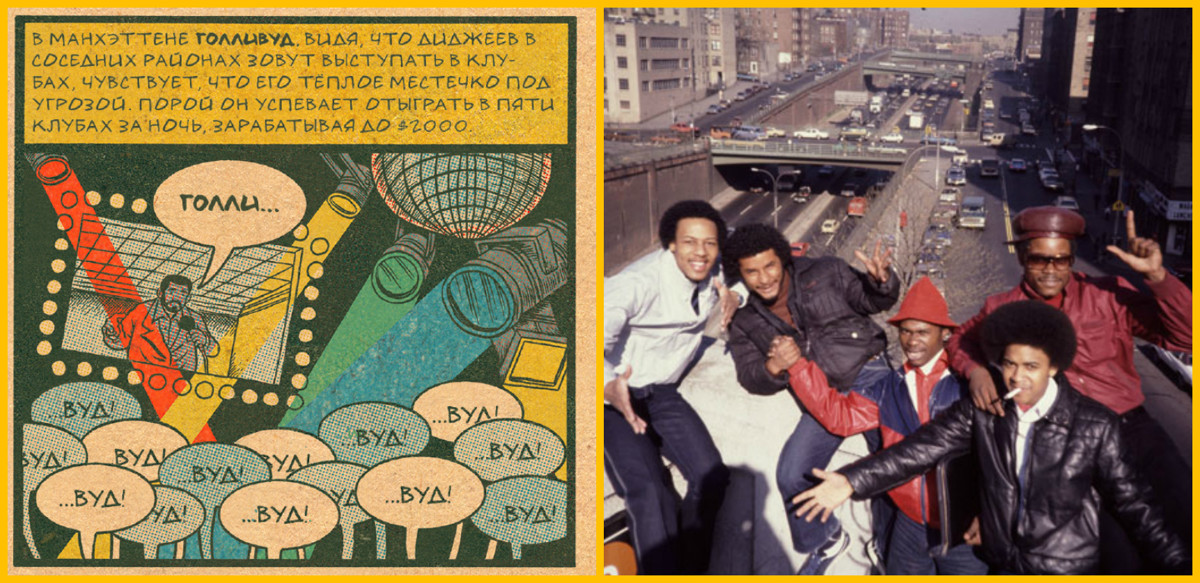 СВ: А кто главные персонажи этого комикса? Ну, вот уже очевидно, что это DJ Kool Herc (в комиксе превратившийся в Кул Хёрка — прим.), который появляется даже в сериале Винил, — как родоначальник всего этого движения. Это, наверное, The Sugarhill Gang, Grandmaster Flash (получивший в Родословной хип-хопа имя Грэндмастер Флэш — прим.)?