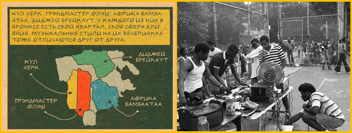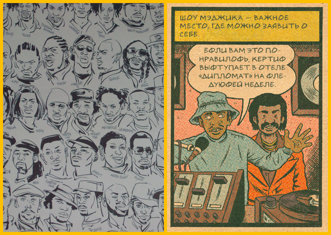 ИВ: Всё гораздо шире! Среди героев комикса не только диджеи или исполнители, но и би-бои, и даже граффити-артисты. То есть сам автор намеренно придает этому ещё и социальный контекст. Если просто смотреть картинки, то это не особенно заметно, но читая примечания, понимаешь, как там всё было взаимосвязано. Эд пишет, что вот там были банды: здесь такая-то, здесь такая. Всё это расширяет понимание причин, почему история стиля развивалась именно так, а не иначе.