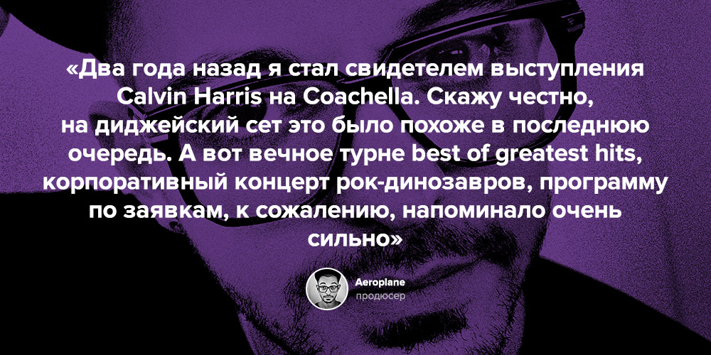 Да, и что еще касается проектов вроде Calvin Harris. Вся солянка хитов из чартов запрограммирована, публика пришла вкусить McCalvin Menu, и ингредиенты должны в точности соответствовать «стандартам вкуса». Это так предсказуемо, безопасно и неинтересно. В чем отличие от прослушивания идентичного плейлиста на Spotify? Сути диджеинга в таких выступлениях нет вообще — это просто отрепетированное шоу с двумя флешками, осветительным оборудованием, лазерами и пиротехникой.