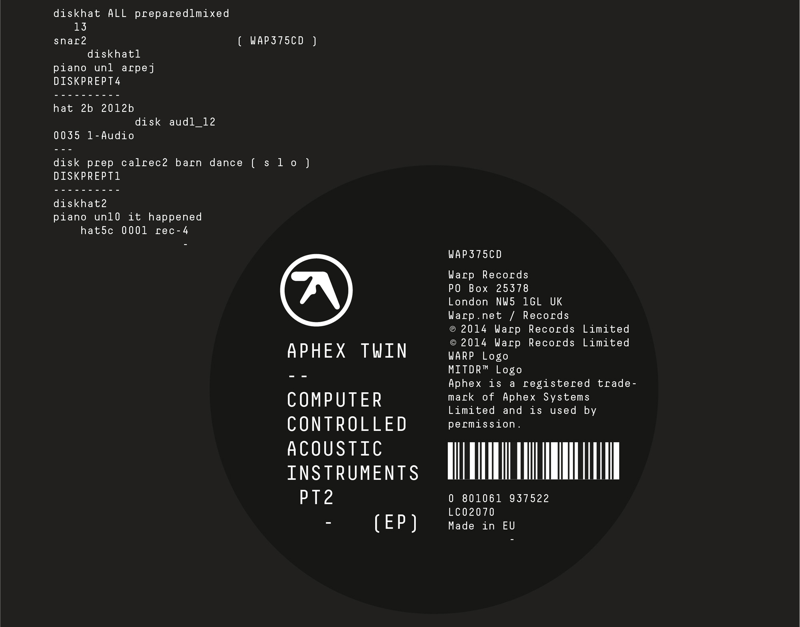 Большие новости, большие планы и совсем немного доступной информации о мини-альбоме «Computer Controlled Acoustic Instruments Pt. 2», который выходит на Warp Records 23 января: привычно-неадекватные названия треков в плейлисте и сдержанное оформление. Ждем с нетерпением.