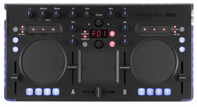 Большие LED-секции по обоим сторонам аппарата визуализируют уровни громкости и другие параметры, а возможности работы с метками, лупами, А/В синхронизацией, тач-вертушки, эквалайзер, pitch-контроль, обработка звука с помощью процессора эффектов Kaoss и многое другое выводят контроллер на профессиональный уровень. Стерео и микрофонный входы можно использовать в качестве USB-аудиоинтерфейса. В автономном же режиме Korg Kaoss DJ становится традиционным многоканальным микшером.