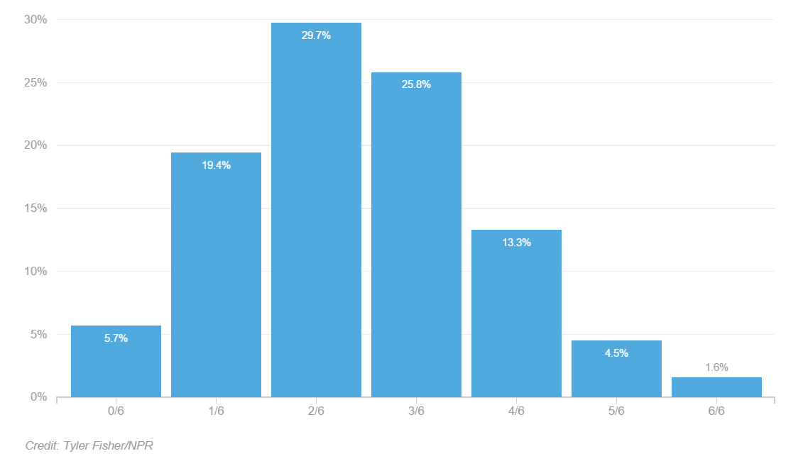 Если считать 3 правильных ответа из 6 за неудовлетворительный результат, тогда 80,7% пользователей провалили тест. Эта диаграмма показывает процентное соотношение пользователей с каждым из возможных результатов.
