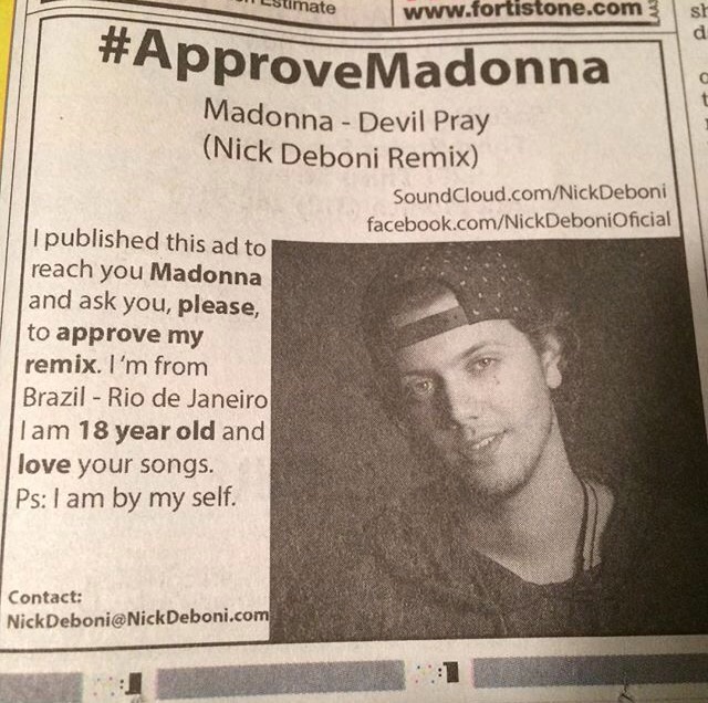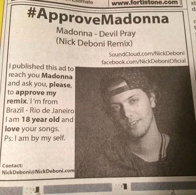 Восемнадцатилетний бразилец Ник Дебони пошел именно на такой отчаянный шаг, чтобы обратить внимание к своему ремиксу на трек c ее последнего альбома «Rebel Heart». Площадкой для отчаянного крика души стала газета The Los Angeles Times, в которой юный продюсер разместил обращение к Мадонне с просьбой оценить его работу.