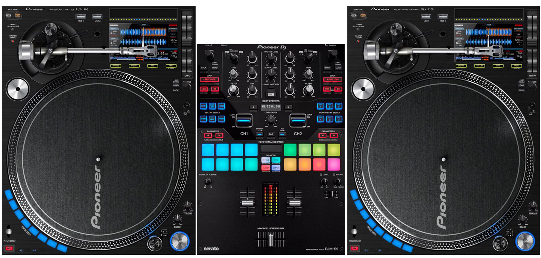 Названная Pioneer PLX-1100 (с намеком на следующее поколение вертушек компании) диковинка в деталях переносит лучшее из функциональности CDJ-деки в плоскость проигрывателя винила, вплоть до кнопки Sync, экранов со звуковой волной и USB-входов.