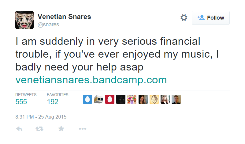 Тогда в своем Твиттере артист признался, что испытывает серьезные финансовые сложности и попросил фанов по возможности покупать его бэк-каталог, оперативно опубликованный на Bandcamp.