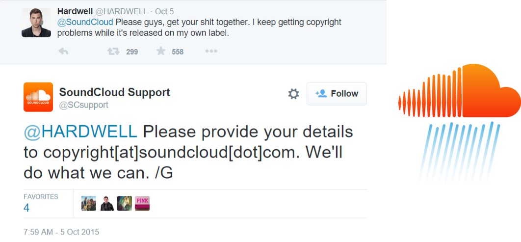 На прошлой неделе такая политика администрации привела к конфликту с Hardwell, одним из самых популярных пользователей — об этом сообщают Dancingastronaut и YourEDM. Роботизированные алгоритмы определения нарушающих авторское право материалов серьезно подвели SoundCloud, и администраторы удалили со страницы артиста треки, изданные на его собственном лейбле. Голландец быстро отреагировал на происходящее с помощью Твиттера.