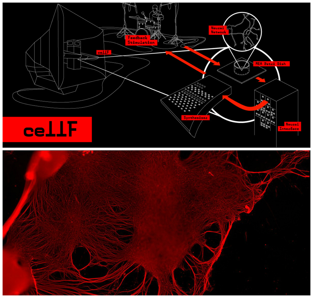 Принцип работы cellF таков: нейроны воспринимают музыку как стимуляцию электрическими импульсами и отвечают изменениями параметров синтезатора, что формирует, давайте назовем это так, «импровизированный пост-человеческий звуковой ландшафт».