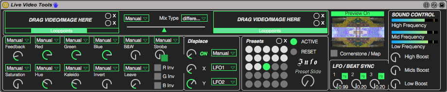 Благодаря интуитивному интерфейсу можно в пару кликов импортировать видео, фото и GIF-анимацию для манипуляций с помощью переназначаемых эффект-контроллеров, которые управляют фидбеком, RGB-уровнями, строб-импульсом, инверсией и другими параметрами. Live Video Tools поддерживает автоматизацию и модуляцию на лету для достижения интересных сочетаний видео со звуком.