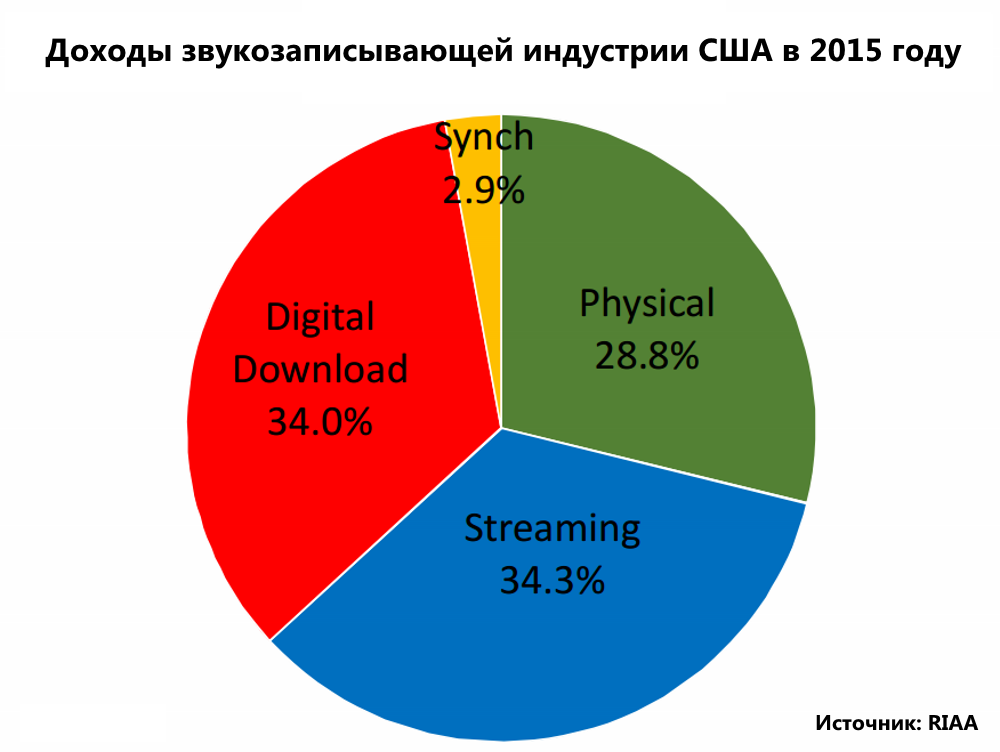 Доходы правообладателей от стримингов (Spotify, Apple Music, Google Play Music, Pandora и так далее) в 2015 году выросли на 29%, достигнув отметки в 2,4 миллиарда долларов — это 34,3% от общей суммы доходов всей индустрии. Выручка от платной загрузки треков в прошлом году упала на 10% — до 2,3 миллиардов долларов (это 34% всей прибыли). Продажи физических носителей сократились на 10% и принесли доход в 2 миллиарда долларов (28,8% от общего количества).