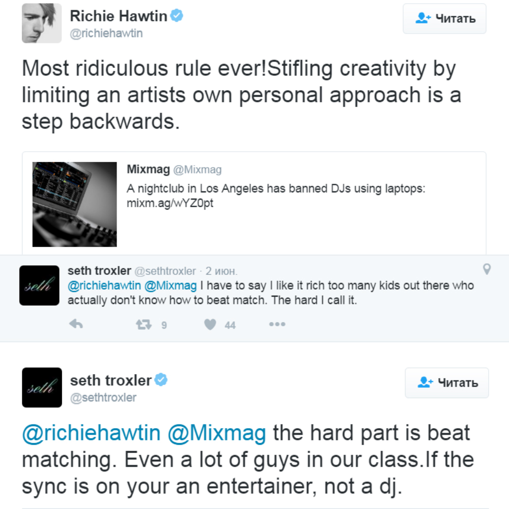В итоге, споры между старой и новой школой диджеинга вышли на новый виток, но интереснее всего было наблюдать за реакцией на запрет со стороны топовых диджеев. Ричи Хоутин и Сет Трокслер вступили в дебаты в Твиттере, озвучив противоположные мнения.