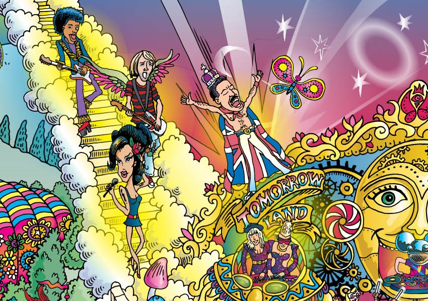 Роль Уолли, которого нужно отыскать в толпе, выполнили звезды музыкальной сцены. Адам изобразил на своем мега-рисунке Daft Punk, Major Lazer, Deadmau5, Gorillaz, Дэвида Боуи и многих других. Сюрреализма происходящему на картинке добавили музыканты из прежних эпох. Получился своего рода фестиваль мечты, где в одном лайнапе уживаются Адель, Джимми Хендрикс, Эмми Уайнхаус и Курт Кобейн.