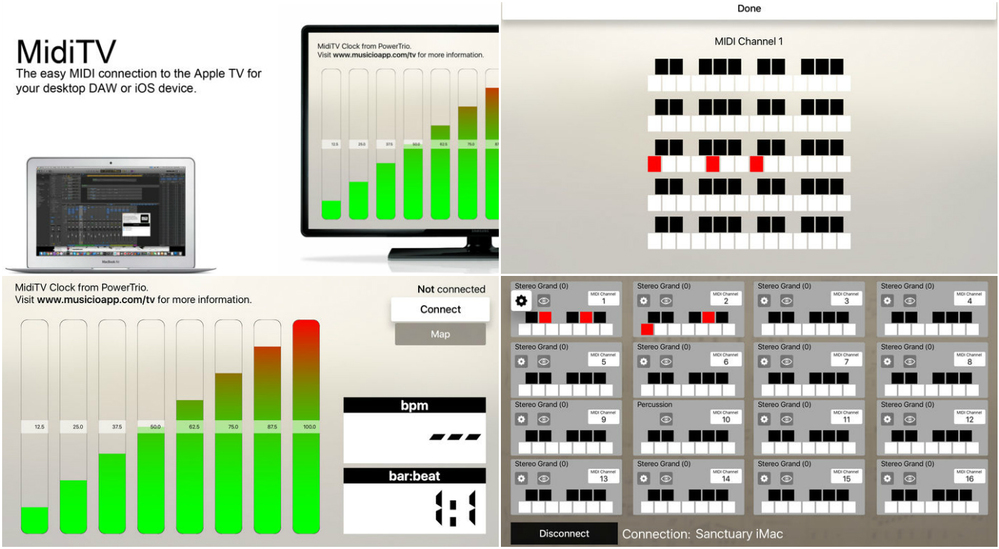 Комбинация MidiTV и Apple TV превращает внешний монитор или телевизор в полноэкранную платформу для музыкальных приложений: можно использовать медиаплеер для работы с MIDI-программами, полноценно работать с DAW или с управляемыми через MIDI VJ-приложениями на дополнительном экране и так далее.