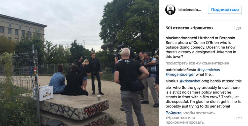 The Black Madonna дополнила публикацию комментарием, что фото сделал ее муж, возвращаясь с вечеринки домой. Сомнений нет, он снял именно Конана! Эту рыжую шевелюру не спутать ни с чьей другой. Посмотрим, что из этого выйдет. И насколько далеко зайдет комик, познавая ночную жизнь Берлина. Стоит отметить, что в последнее время он все чаще снимает специальные эпизоды своего шоу за пределами Америки. К примеру, после восстановления дипломатических отношений США и Кубы, Конан стал одним из первых, кто отправился с визитом в бывшую коммунистическую страну, и снял там роскошный часовой эпизод. Или этой весной О’Брайен представил выпуск «Конан в Армении», туда он отправился вместе со своей ассистенткой, родившейся в Ереване, но много лет не бывавшей на родине.