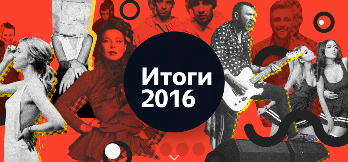 Вслед за российским Apple Music, подвело локальные итоги года и музыкальное подразделение компании Яндекс. При подсчете учитывались прослушивания в веб-версиях и через приложения Яндекс.Музыка и Яндекс.Радио — общая месячная аудитория сервисов в 2016 году превышала 20 миллионов человек. С января по декабрь пользователи сделали более 7 миллиардов прослушиваний (чтобы достигнуть такого результата, одному меломану потребовалось бы больше 30 000 лет).