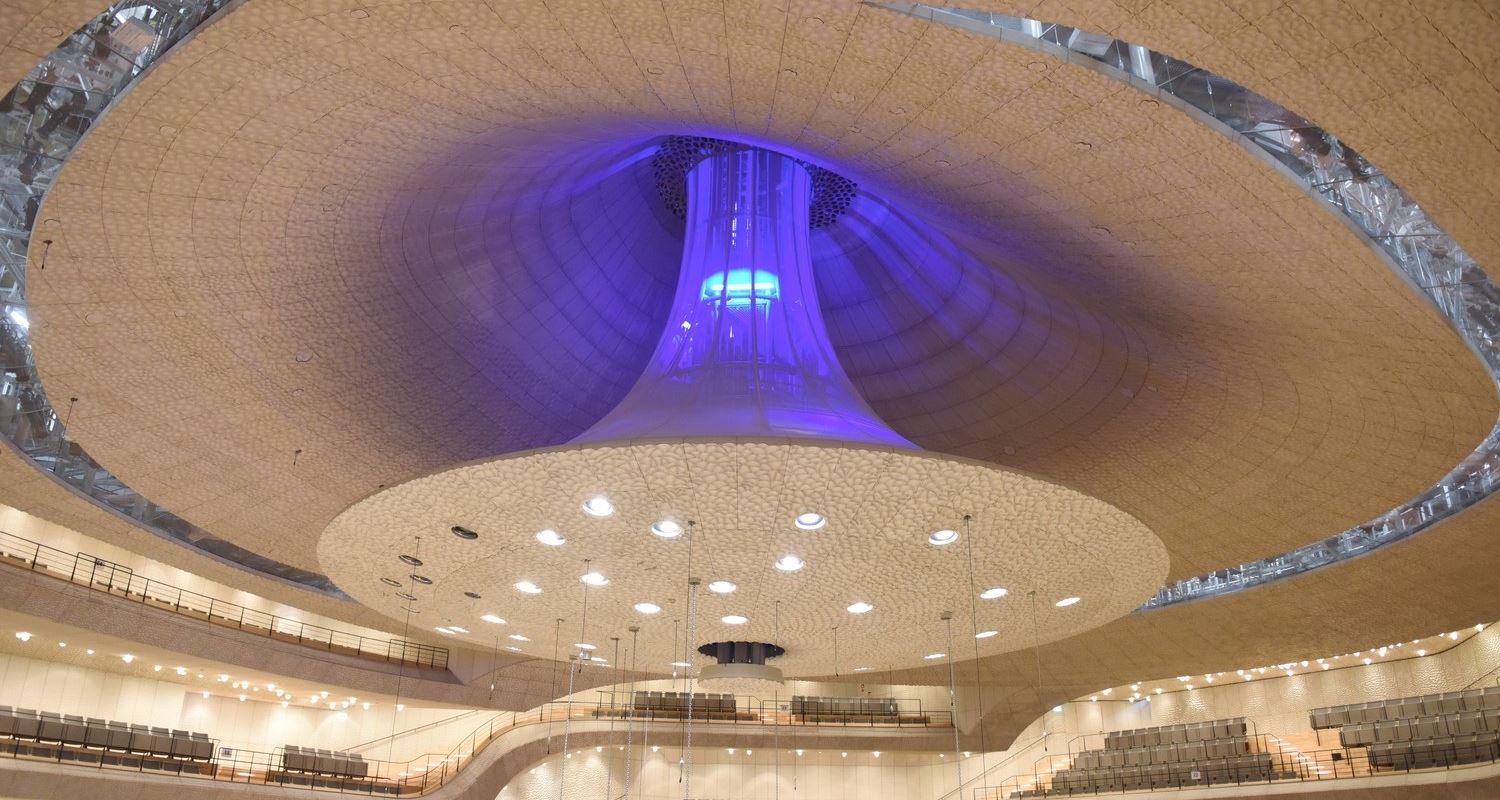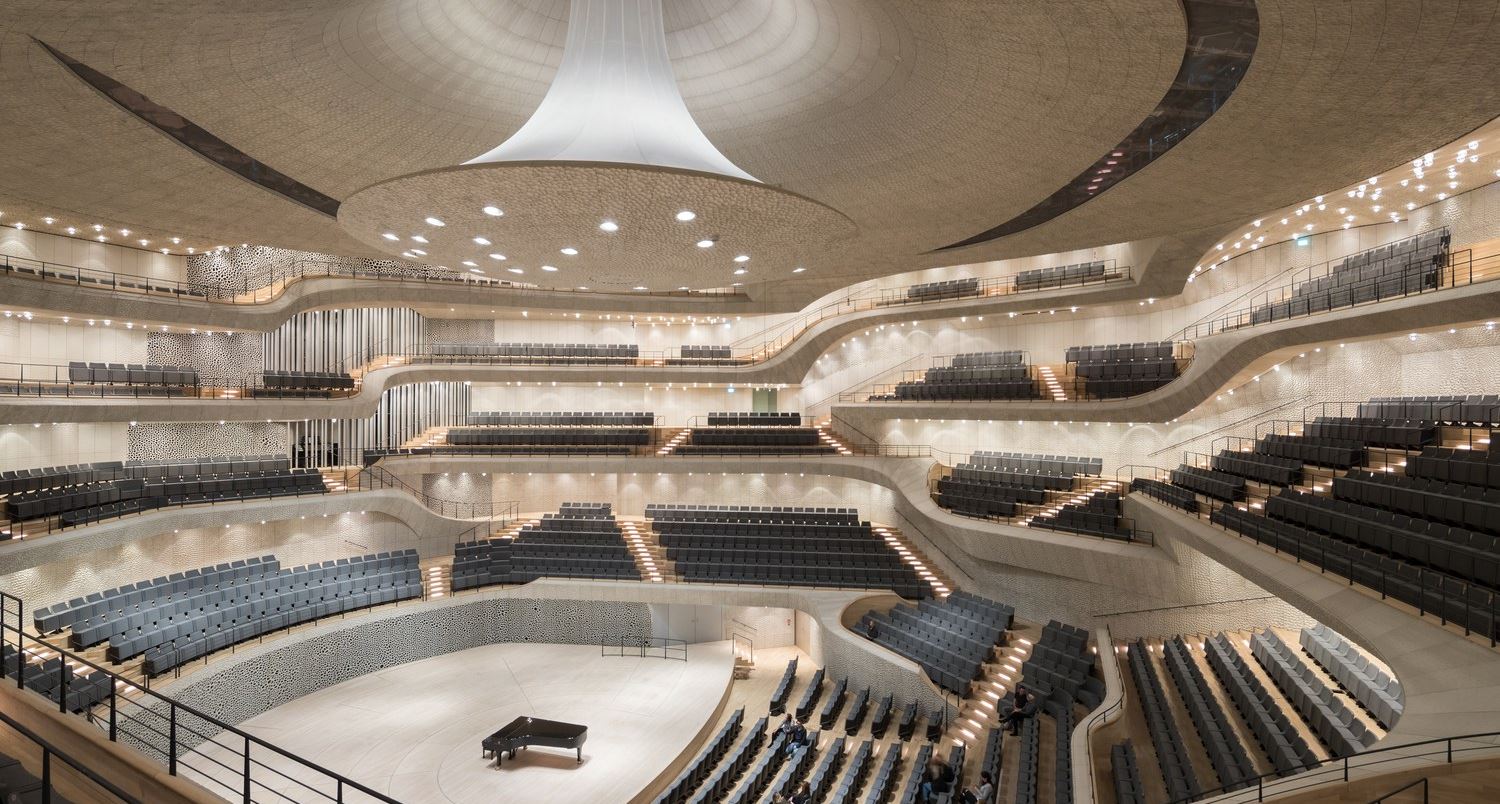 Elbphilharmonie привлекает внимание с точки зрения дизайна: величественный волнообразный фасад, лифты изогнутой формы и лестницы с визуальным эффектом бесконечности. Тем не менее, настоящий шедевр в сооружении за 843 миллиона долларов — это единственный в своем роде панорамный концерт-холл с тщательно сбалансированным звуком.
