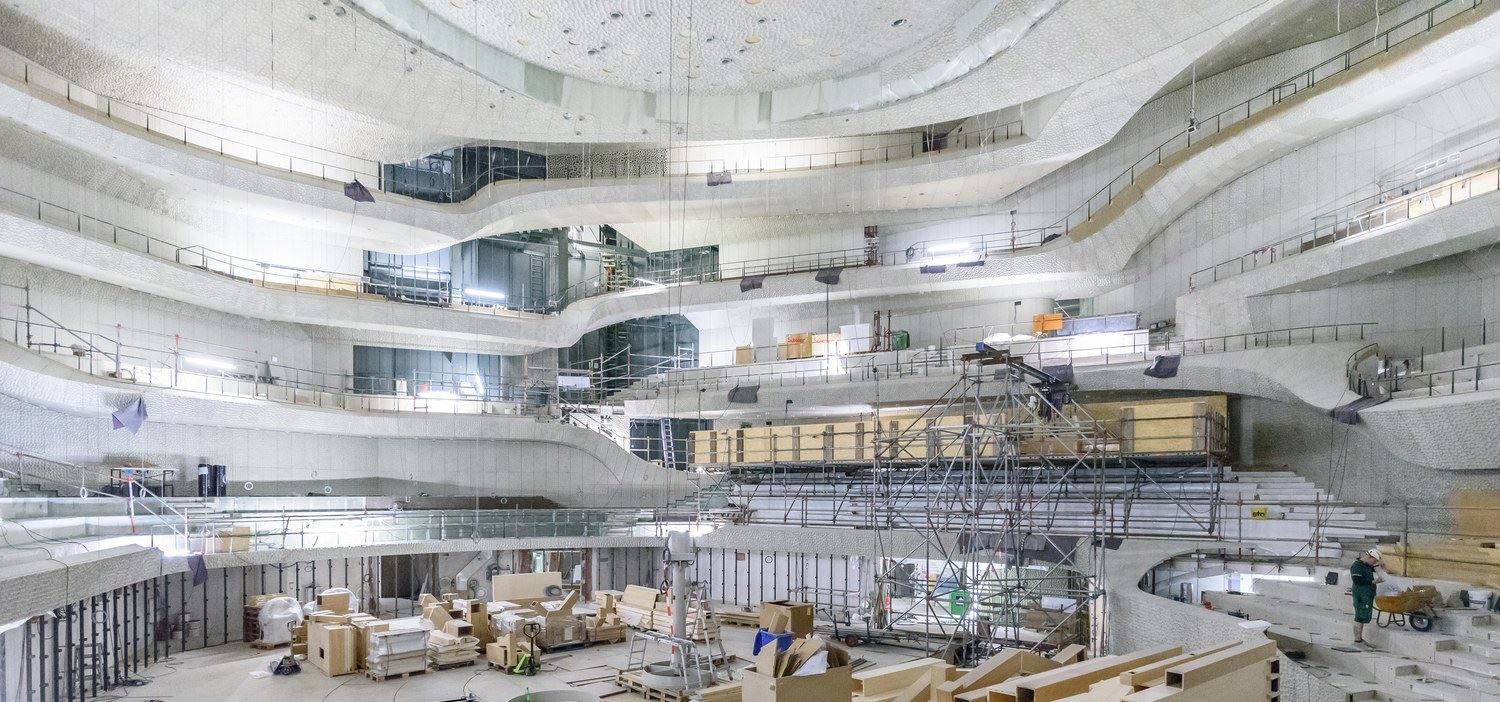 Как пишет Wired, оригинальное акустическое решение — совместное детище швейцарской архитектурной фирмы Herzog & De Meuron и канадского дизайнерского бюро One2One Studio. Результатом кропотливого труда стала напоминающая коралловый риф конструкция из 10 000 акустических панелей, которая обволакивает потолок, стены и балюстрады. Всего в акустической форме находится миллион специальных ячеек, равномерно рассеивающих звук по всему залу.