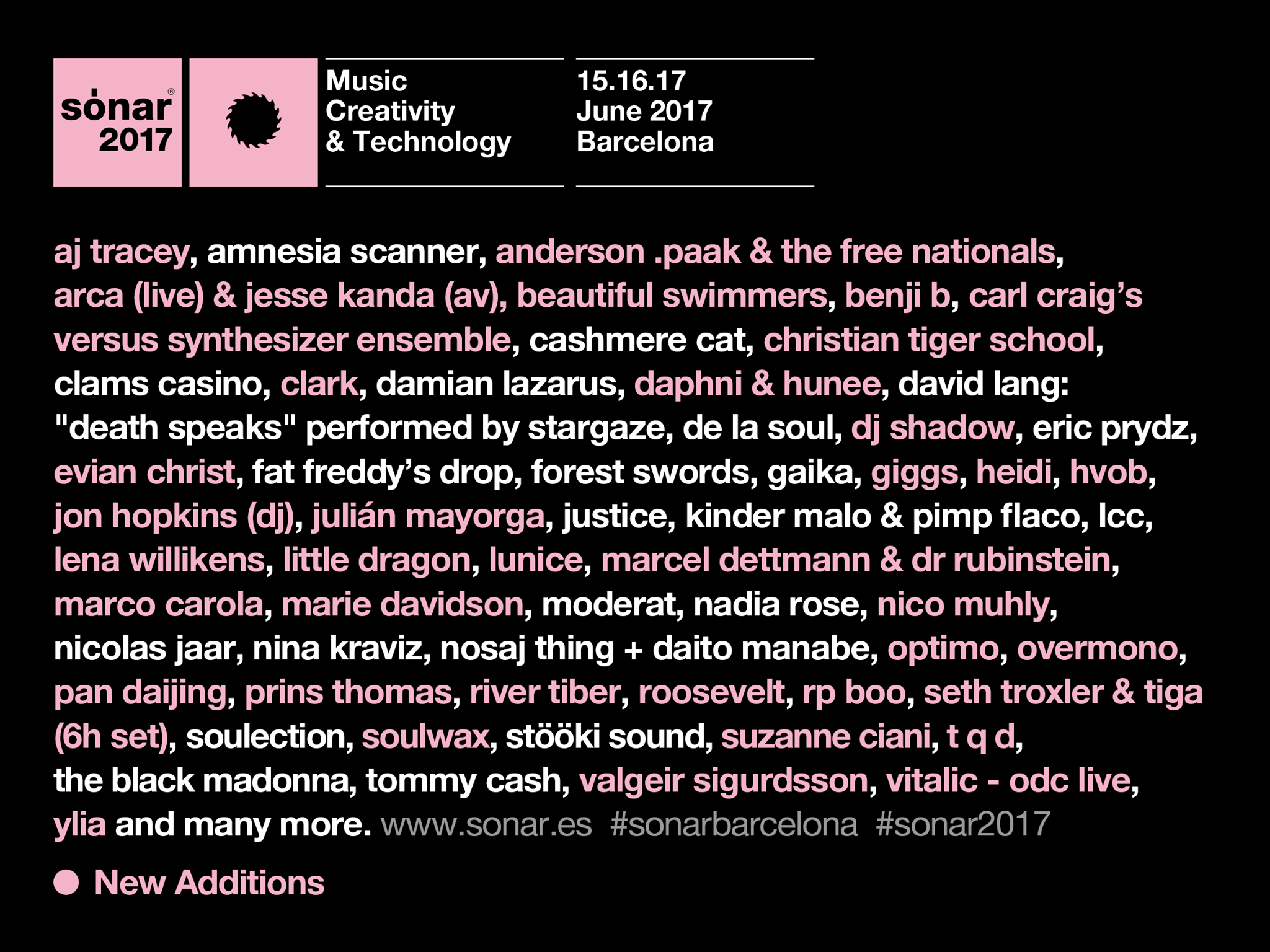 К уже известным ранее хедлайнерам — Justice, Нине Кравиц, Николасу Джаару, De La Soul — Sónar Festival 2017, который состоится в Барселоне с 15 по 17 июня, добавили список из еще нескольких десятков артистов: Eric Prydz, DJ Shadow, Marcel Dettmann, Arca, Soulwax, Seth Troxler, Tiga, Vitalic, Jon Hopkins, лайв-группа Карла Крейга, Damian Lazarus, Black Madonna и многие другие. Наиболее полный на данный момент список участников можно посмотреть ниже.