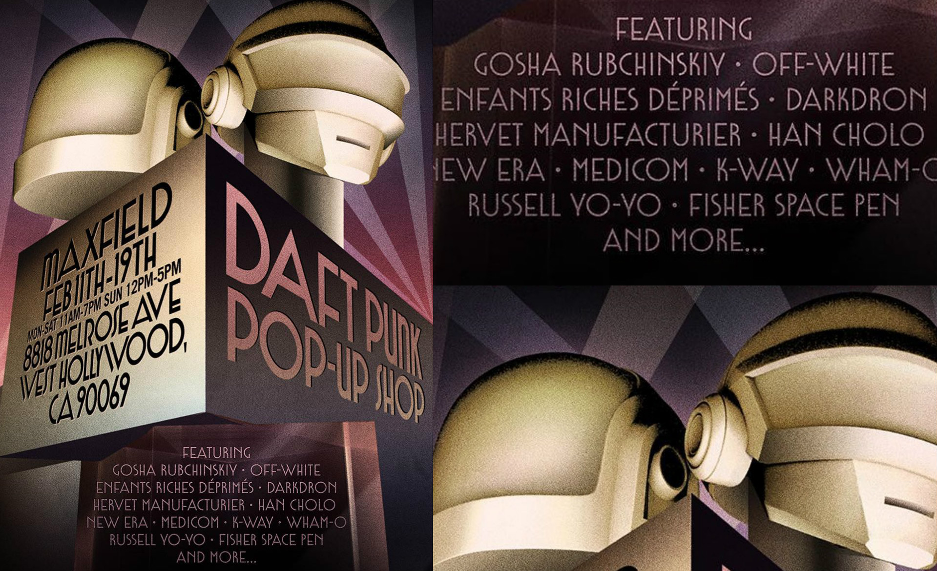 В это воскресенье, 12 февраля, Daft Punk дадут первое за последние 3 года живое выступление. За день до этого при поддержке галереи Maxfield в Западном Голливуде откроется эксклюзивный поп-ап магазин, который проработает с 11 по 19 февраля.