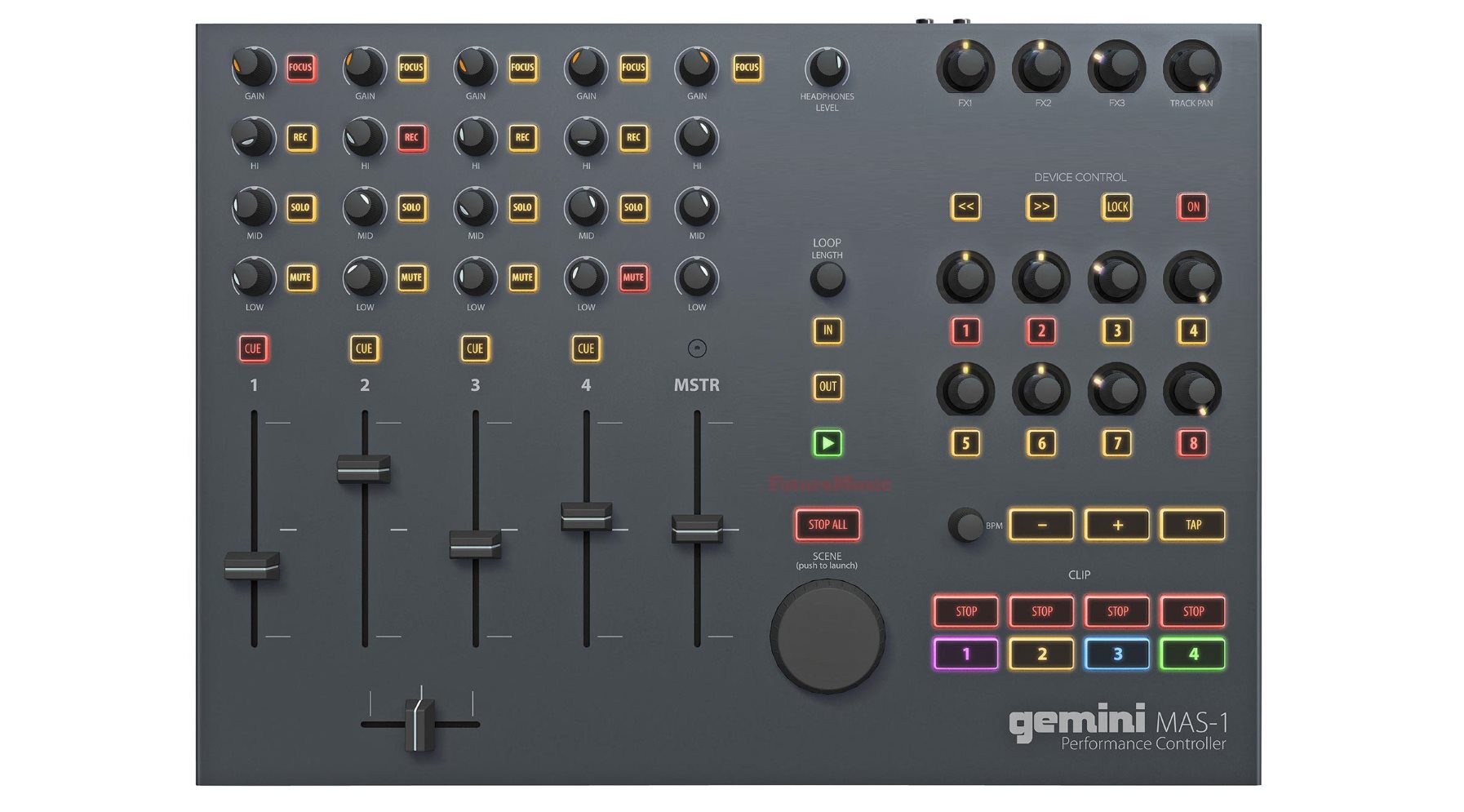 Помимо нового медиаплеера MDJ-900 и DJ-контроллера SDJ-4000, одной из новинок, представленных компанией Gemini на NAMM 2017, стал профессиональный MIDI-контроллер MAS-1. Ориентированное на работу с виртуальной студией Ableton Live от других устройство отличается интерфейсом: вместо обилия пэдов — секция фейдеров. Контроллер рассчитан в первую очередь на диджеев, играющих сеты в Ableton Live (а не в Serato или Traktor).