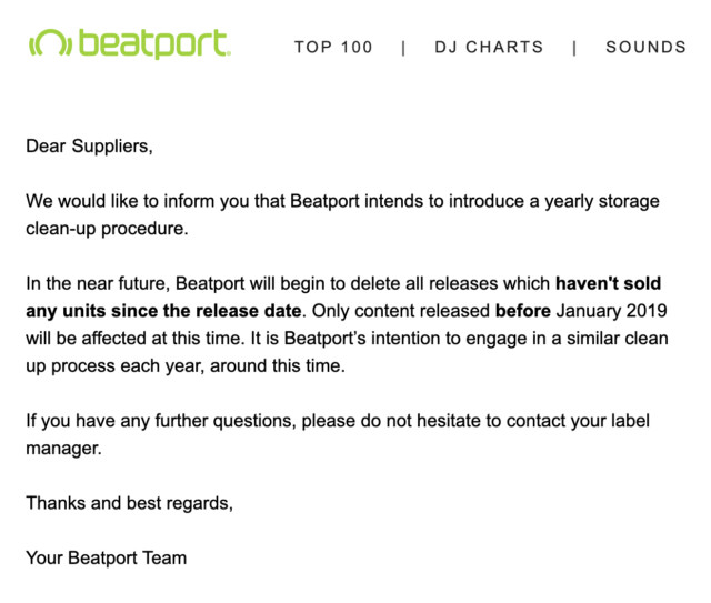 Освобождение хранилища Beatport будет произведено позже в 2019-м в рамках так называемой «ежегодной чистки» от треков, которые не были куплены ни разу с момента релиза. В письме говорится, что это относится только к музыке, выпущенной раньше января 2019 года. Скриншот заявления мы прикрепляем ниже.