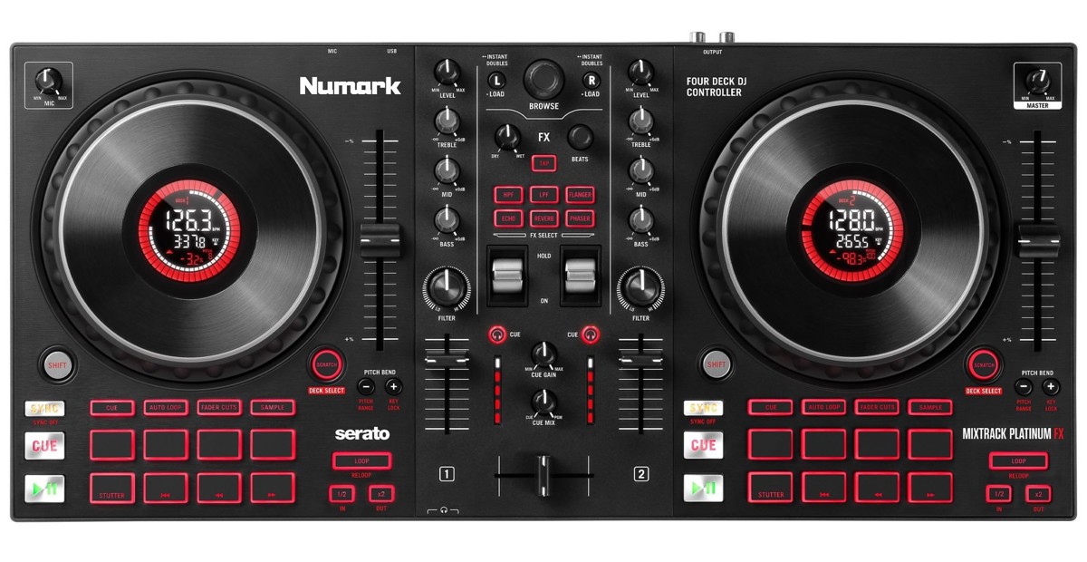 Компания Numark представила пару бюджетных контроллеров для диджеев: 2-канальный Mixtrack Pro FX и 4-канальный Mixtrack Platinum FX (две физические и две виртуальные деки). Оба заточены под работу с Serato DJ.