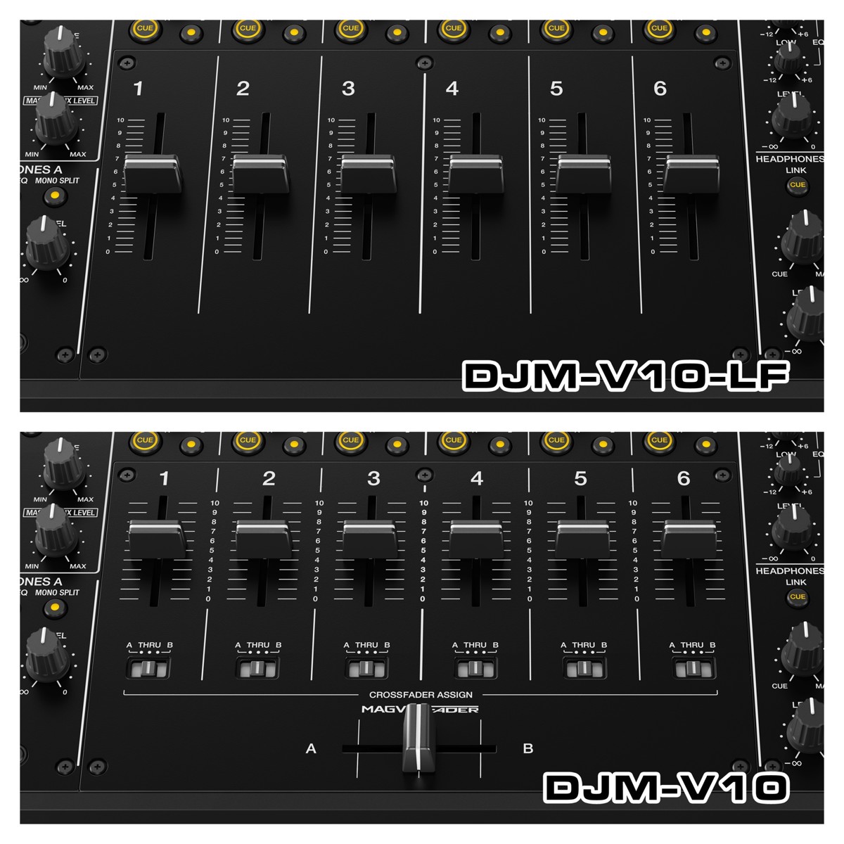 Из новой модели DJM-V10-LF убран кроссфейдер. Вместо этого фейдеры всех 6 каналов стали длинноходнее — 60 мм вместо 45 мм (LF в названии как раз обозначает Long Faders). Казалось бы, так можно более аккуратно контролировать уровни сигнала…